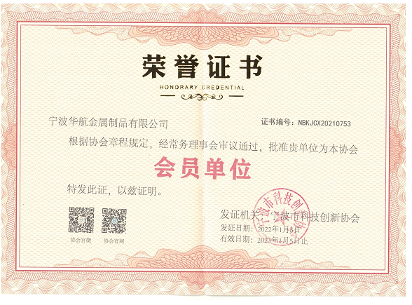 2022年1月5日,經(jīng)寧波市科技創(chuàng)新協(xié)會(huì)的審議通過,寧波華航金屬制品有限公司被批準(zhǔn)為協(xié)會(huì)會(huì)員單位。